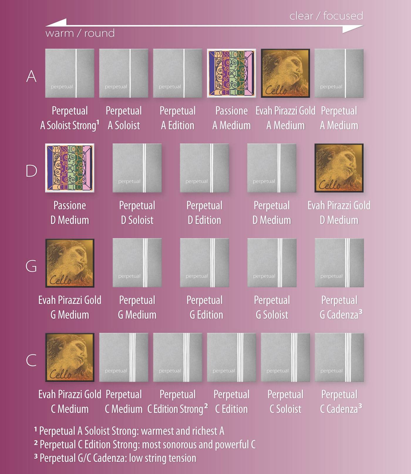D string: “strong” string with great depth and enormous volume. Has a lot of body and plenty of strength, always warm and supportive in tone. Wonderfully easy to play.